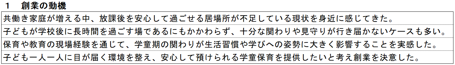 創業の動機では、子どもが好き、地域に貢献したい、働く家庭を支えたいといった思いが出発点になることが多くあります。ただし、この項目では、その思いを背景とあわせて整理することが重要です。
