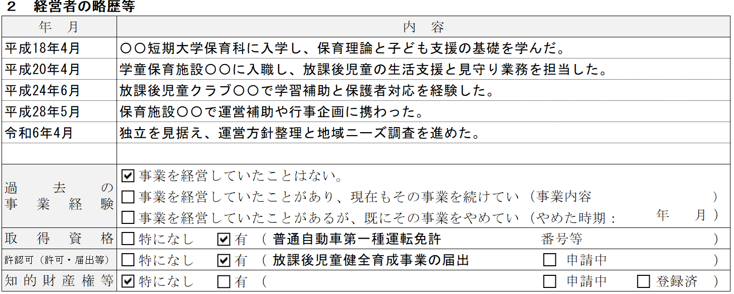 学童保育の記入例② 経営者の略歴等