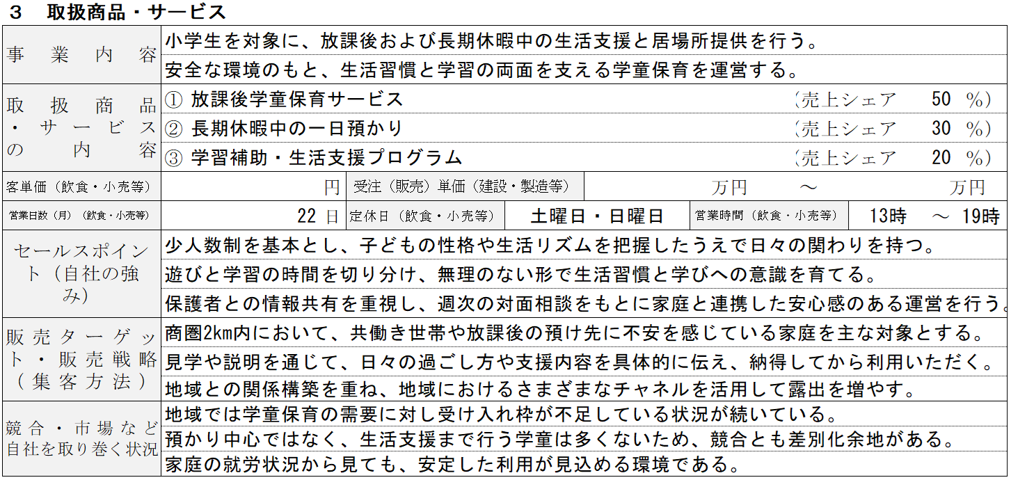 取扱商品・サービスでは、単に預かり時間や定員を示すのではなく、どのような過ごし方を提供するのかという「価値」を整理します。例えば、学習支援を重視するのか、遊びや生活習慣を重視するのかによって、必要な体制や人員は大きく変わるでしょう。