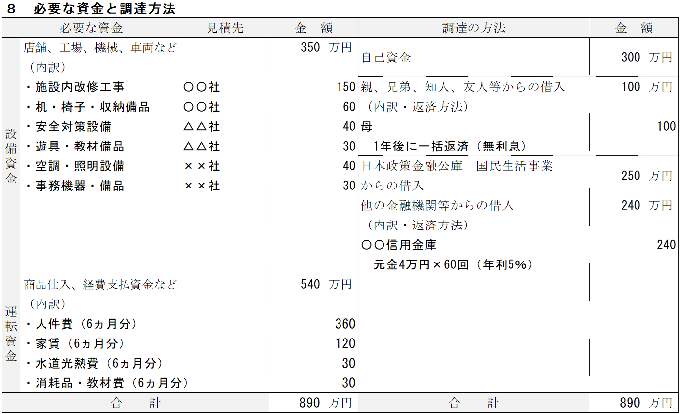 | ⑧必要な資金と調達方法 | 事業で必要になる設備資金と運転資金、そしてそれらをどのように調達するかを整理します。 | ||