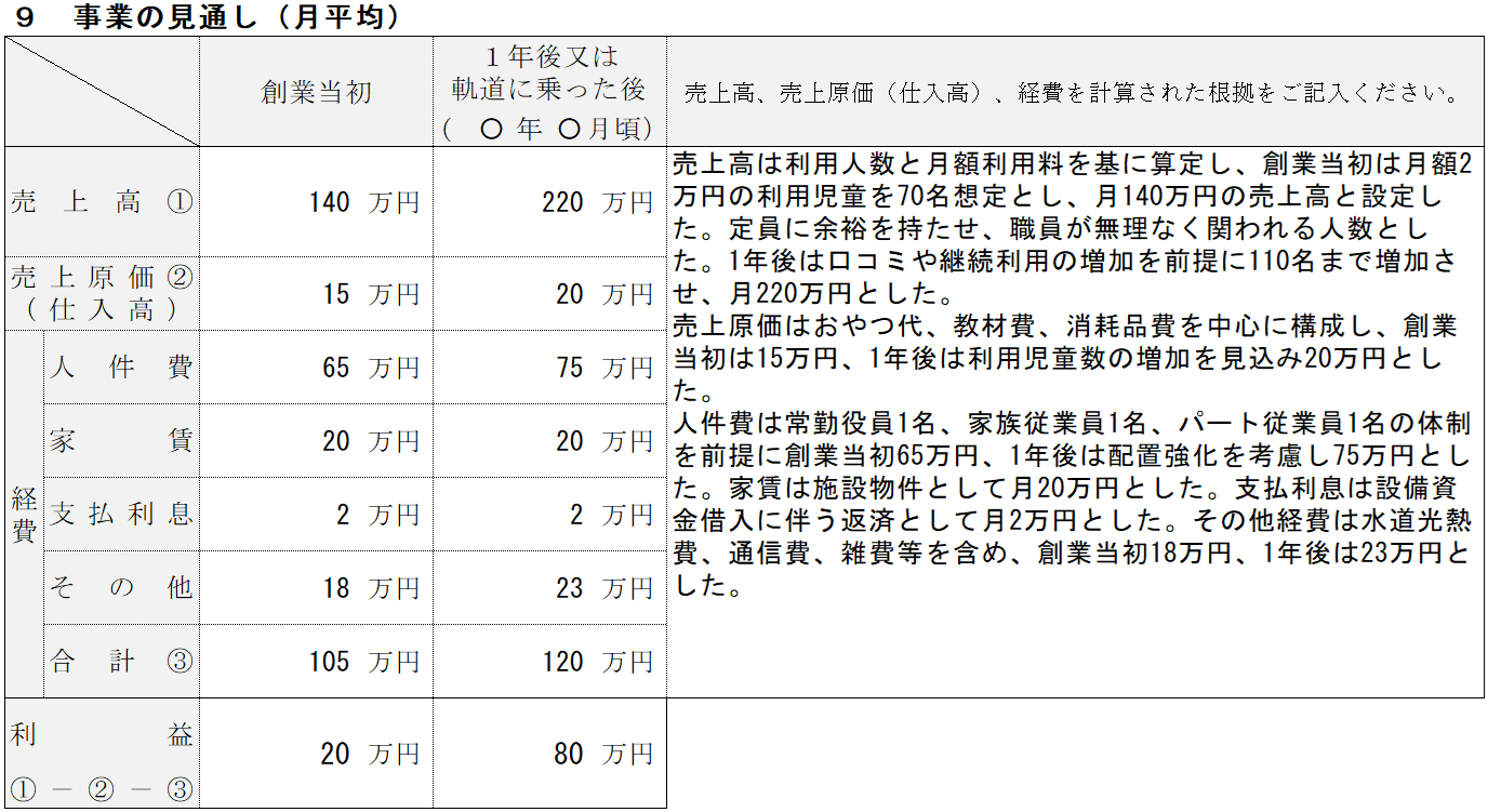 | ⑨事業の見通し | 創業当初から1年後(または事業が軌道に乗った後)の財務計画を、算出根拠と合わせて整理します。 | ||