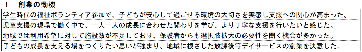 | ①創業の動機 | 「なぜ創業しようと思ったのか」という、事業に対する根源的な思いを整理します。 | ||
