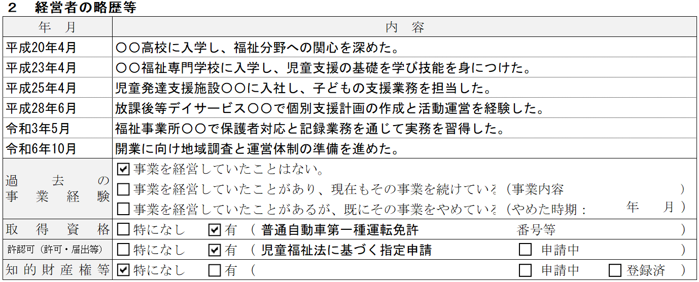 経営者の略歴では、福祉や教育の経験年数だけでなく、どのような立場で子どもや保護者と関わってきたかを整理します。現場支援が中心だったのか、運営や管理に関わる経験があったのかによって、見えている課題は異なります。