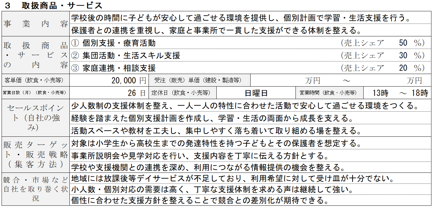 取扱商品・サービスでは、提供する支援内容を列挙するのではなく、市場環境と競合状況を踏まえて、自事業所がどのような役割を担うのかを整理します。