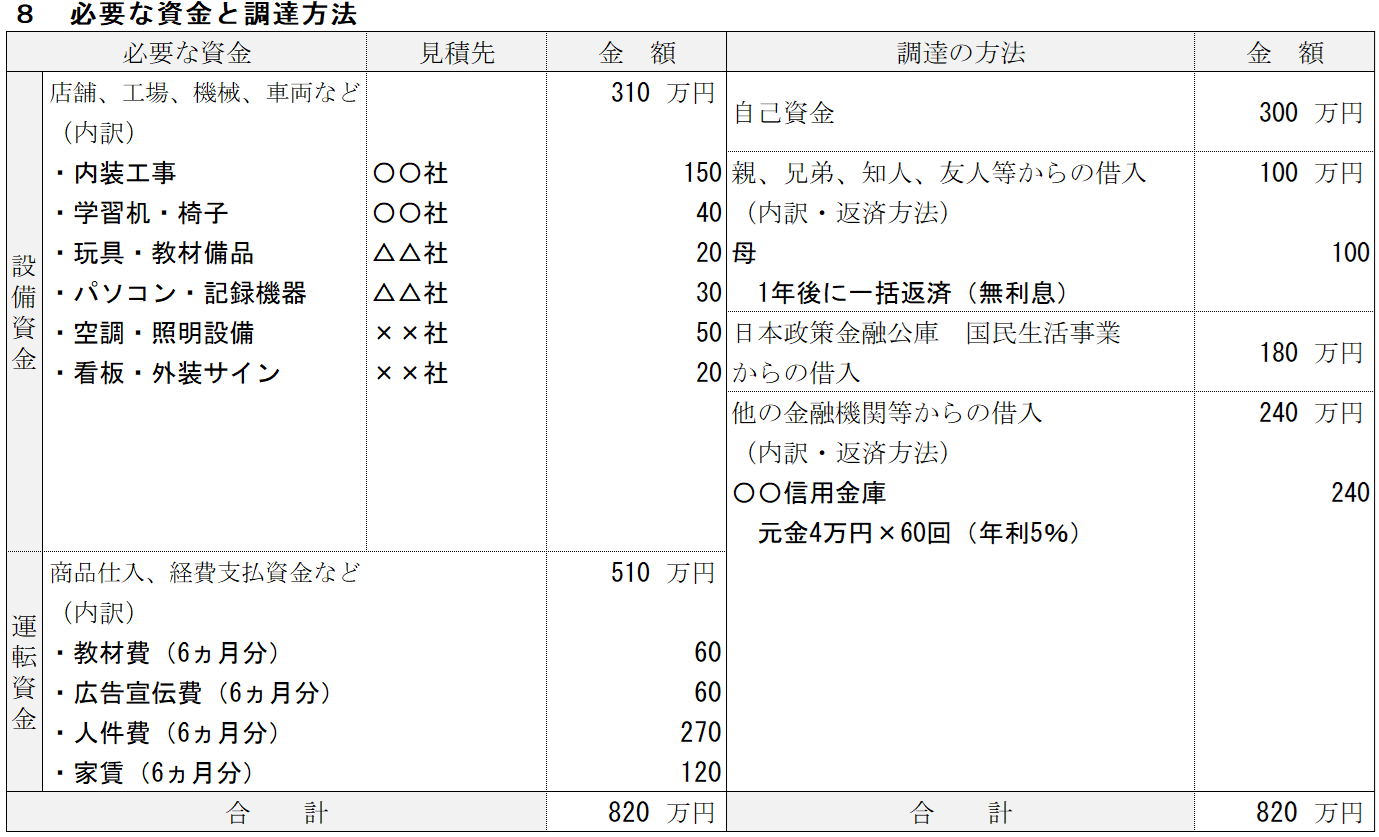 | ⑧必要な資金と調達方法 | 事業で必要になる設備資金と運転資金、そしてそれらをどのように調達するかを整理します。 | ||