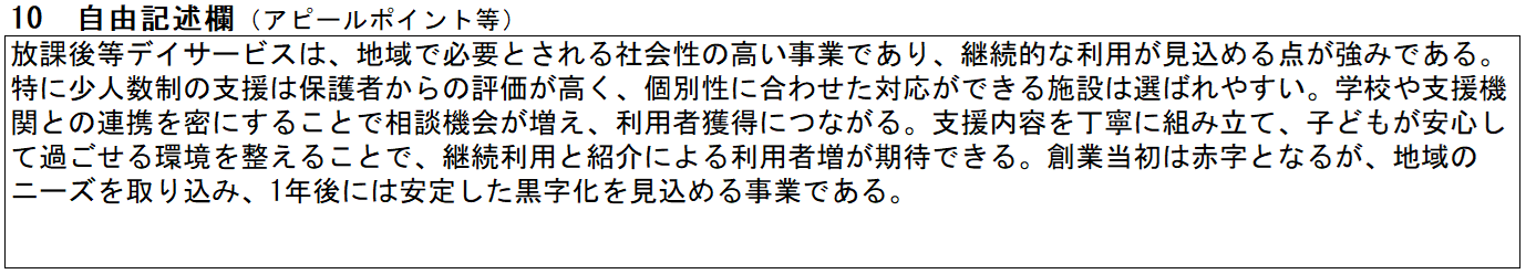 | ⑩自由記述欄 | 他項目では表現できていない事業のアピールポイントを整理します。 | ||