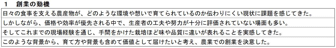 創業の動機では、農業を始めたい理由そのものよりも、なぜ農業を事業として選んだのかを整理します。