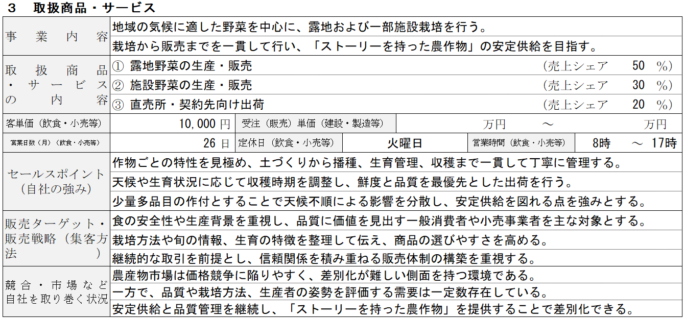 市場と競合を踏まえたうえで、自社がどの作物を、どの販売先に向けて、どのような形で提供するのかを整理します。取扱商品・サービスは生産内容の説明ではなく、市場の中での自社の立ち位置を示す戦略として記載することが求められます。