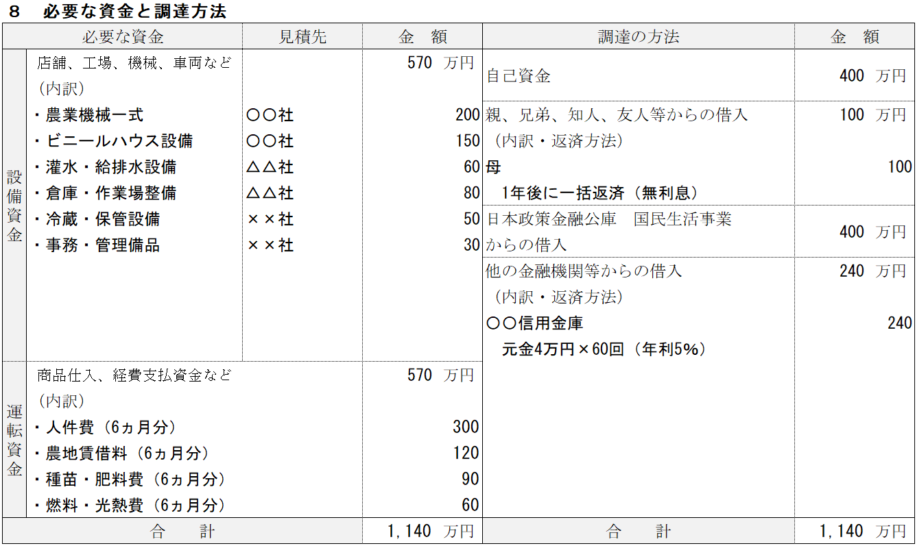 農業の記入例⑧ 必要な資金と調達方法