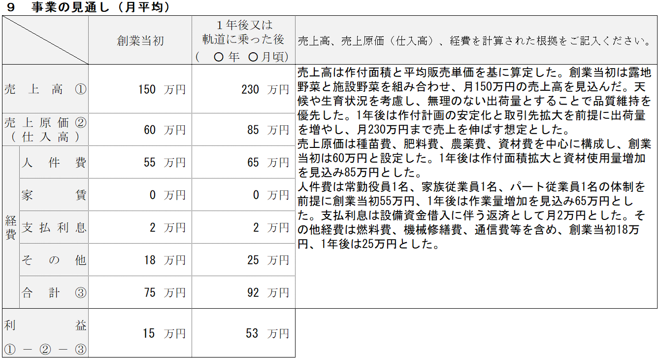 農業の記入例⑨ 事業の見通し
