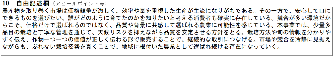 自由記述欄では、これまでの項目では表現しきれなかった考え方や、農業事業を行ううえで大切にしたい姿勢を整理します。数値や構造では表しにくい判断基準を言語化することが、この項目の役割です。