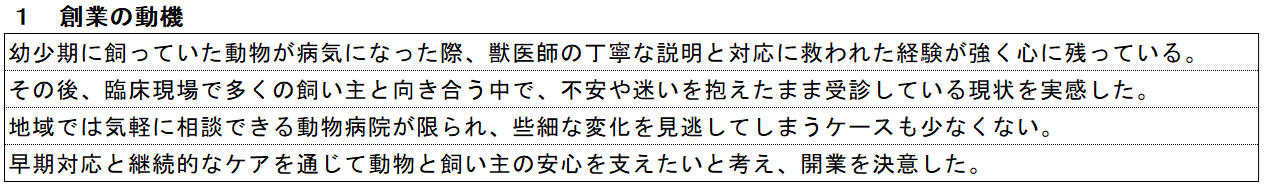 創業の動機では、動物が好き、獣医として独立したいといった理由にとどまらず、なぜ自分で経営判断を担う立場を選ぶのかを整理します。