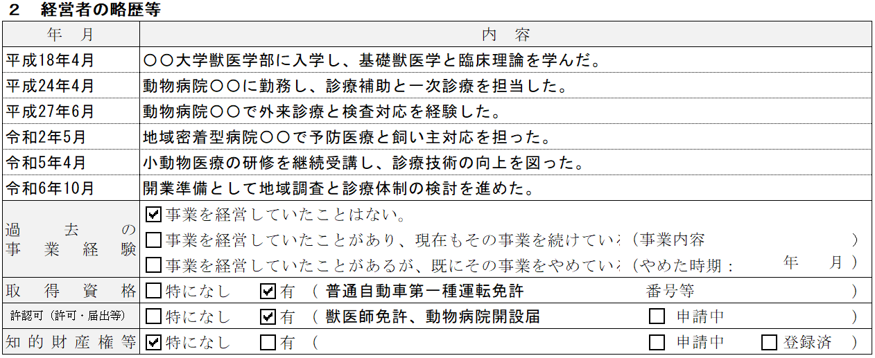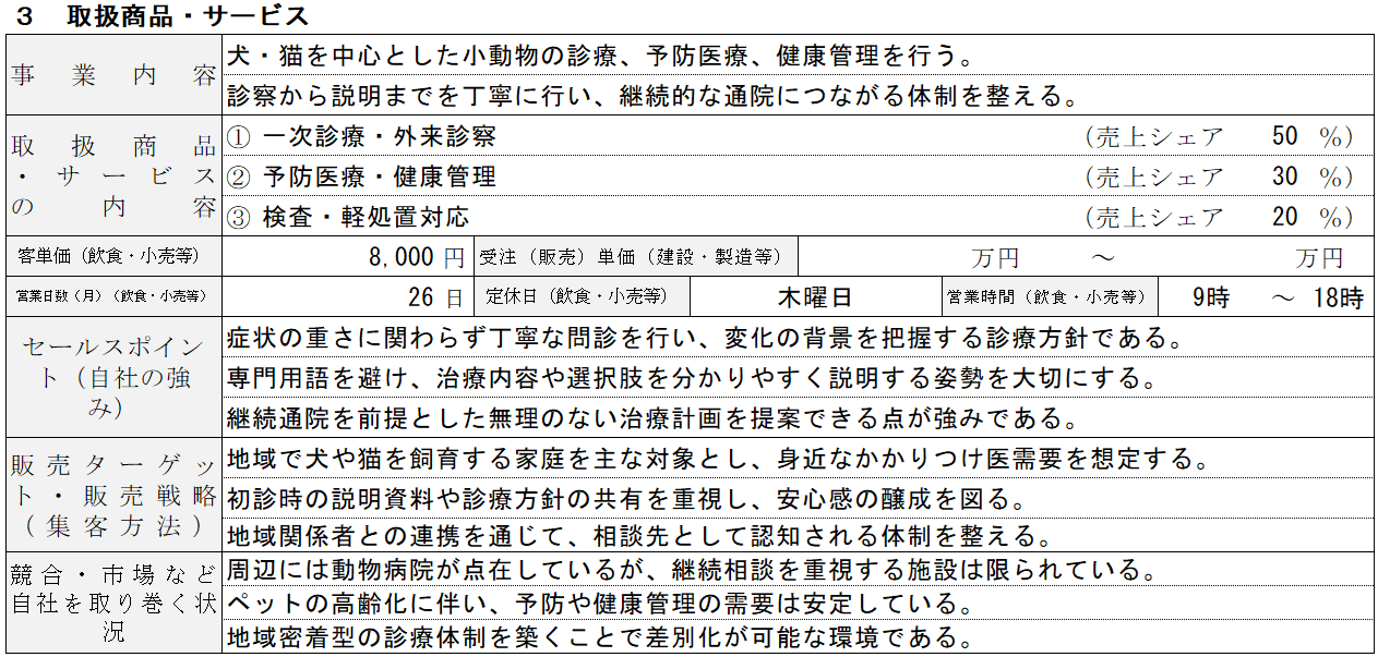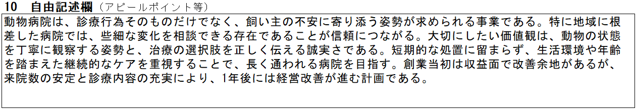 自由記述欄は、計画を美しく見せるための場所ではなく、事業の根底にある思いや判断の背景を言語化するための項目です。ここまで整理してきた内容と一貫性を持たせながら記載することで、動物病院としての考え方がより明確になります。
