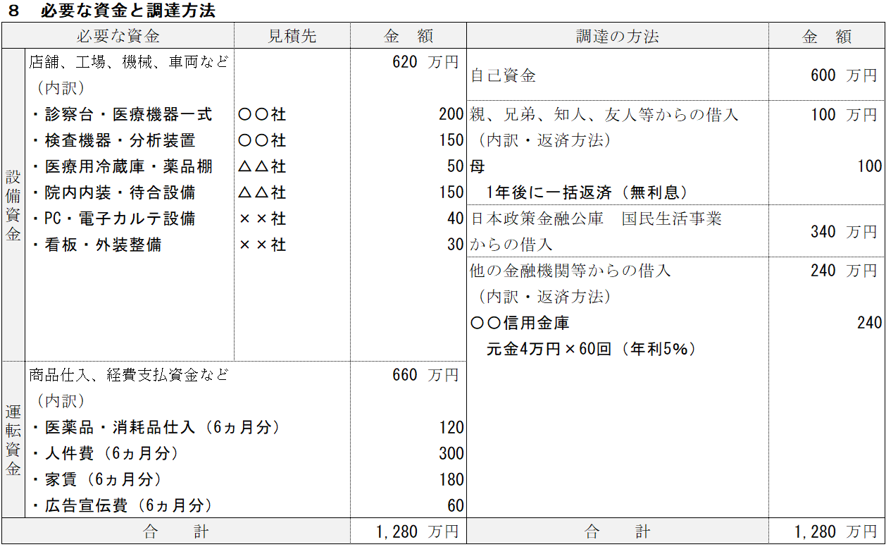 ⑧必要な資金と調達方法事業で必要になる設備資金と運転資金、そしてそれらをどのように調達するかを整理します。