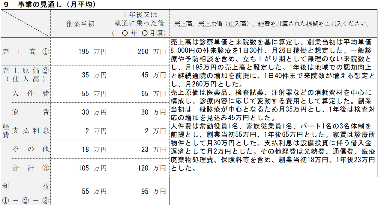 ⑨事業の見通し創業当初から1年後(または事業が軌道に乗った後)の財務計画を、算出根拠と合わせて整理します。