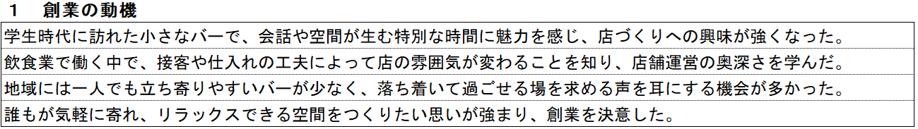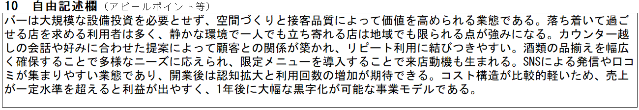 この項目では、なぜ自分がこのバーを継続的に運営できると考えているのか、その根拠を自然に整理することを意識するとよいでしょう。