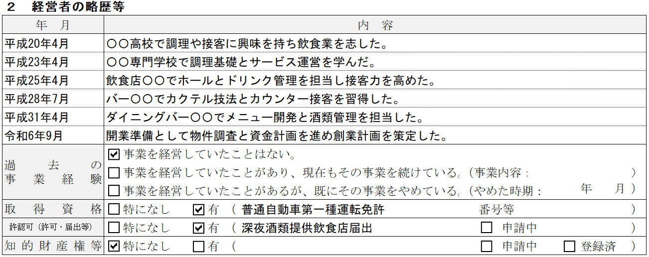 経営者の略歴では、バーテンダーとしての経験や飲食業での勤務歴を並べるだけでなく、それらの経験が今回のバー運営にどのように活かされるのかを整理します。技術面だけでなく、接客姿勢やトラブル対応の経験も重要な要素になります。