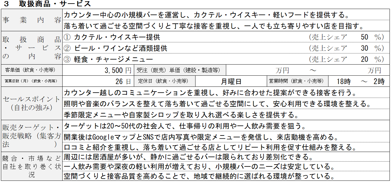 取扱商品・サービスでは、提供するお酒の種類を列挙するだけでなく、どのような体験を提供するバーなのかを整理することが重要です。ウイスキー中心なのか、カクテルを重視するのか、フード提供をどこまで行うのかによって、必要な設備やオペレーションは大きく変わります。