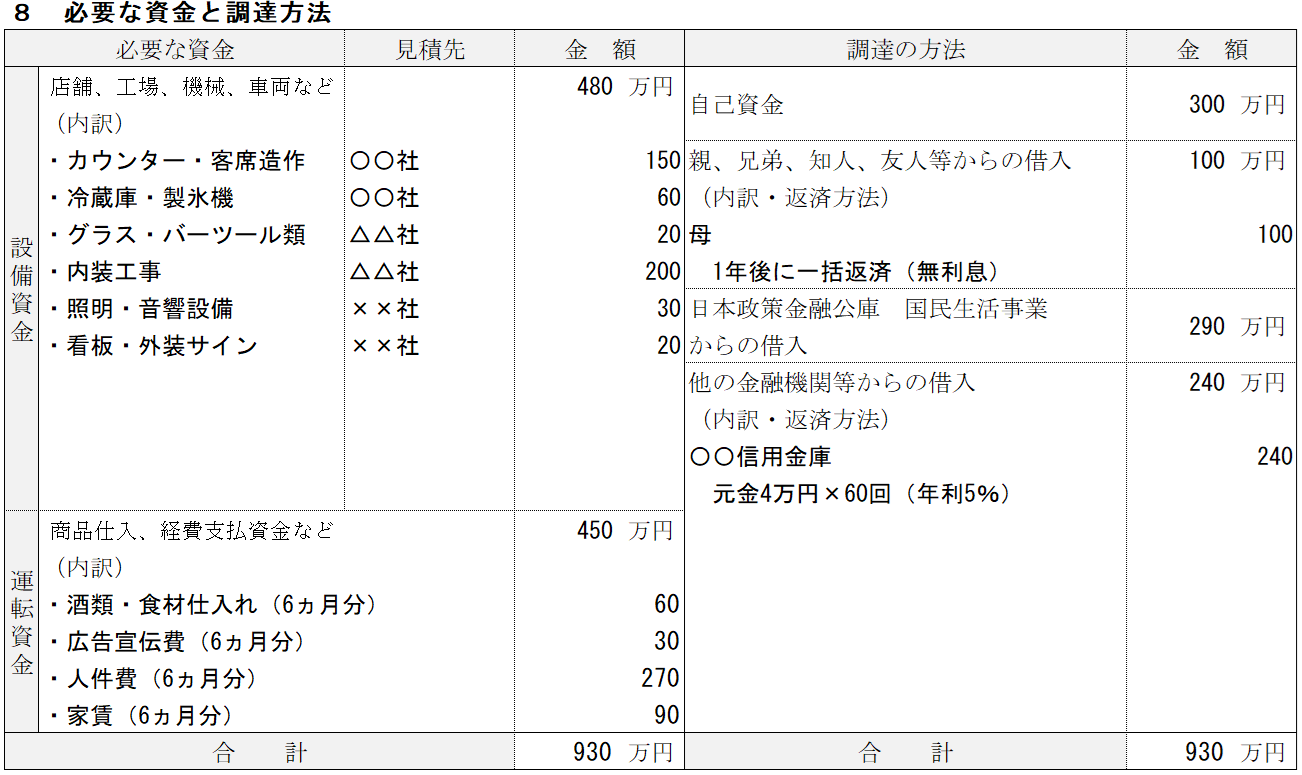 | ⑧必要な資金と調達方法 | 事業で必要になる設備資金と運転資金、そしてそれらをどのように調達するかを整理します。 | ||