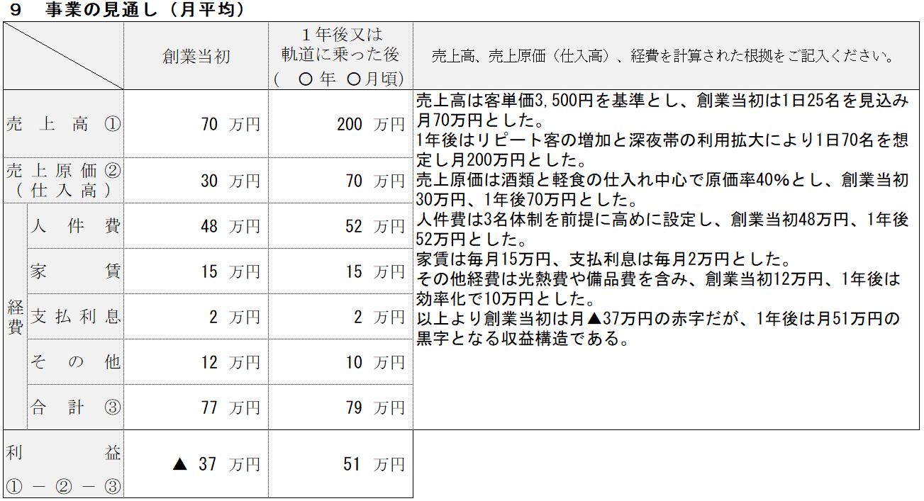 | ⑨事業の見通し | 創業当初から1年後(または事業が軌道に乗った後)の財務計画を、算出根拠と合わせて整理します。 | ||