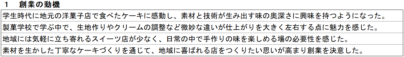 これまでの経験を通じて、なぜこのスイーツ店を運営できると考えているのか、そのつながりが自然に伝わるよう整理することで、事業としての現実味が高まります。