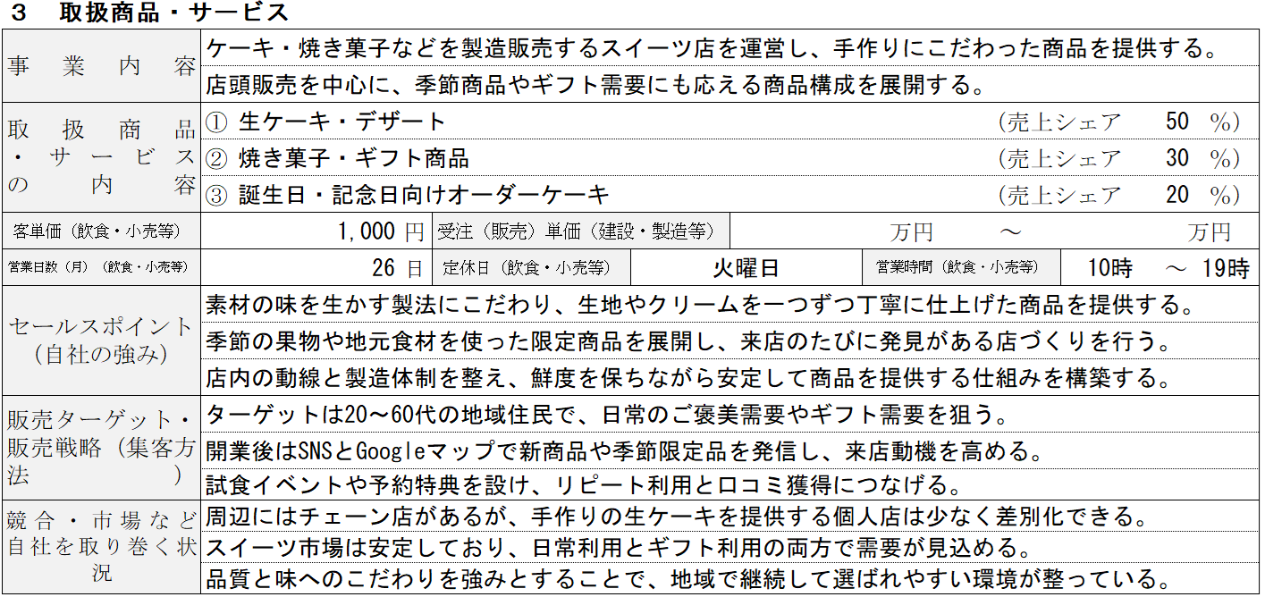 ケーキ屋・スイーツ店の記入例③ 取扱商品・サービス