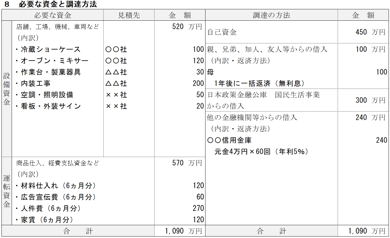ケーキ屋・スイーツ店の記入例⑧ 必要な資金と調達方法