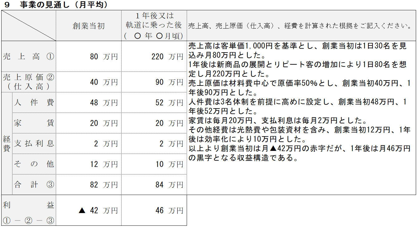 | ⑨事業の見通し | 創業当初から1年後(または事業が軌道に乗った後)の財務計画を、算出根拠と合わせて整理します。 | ||