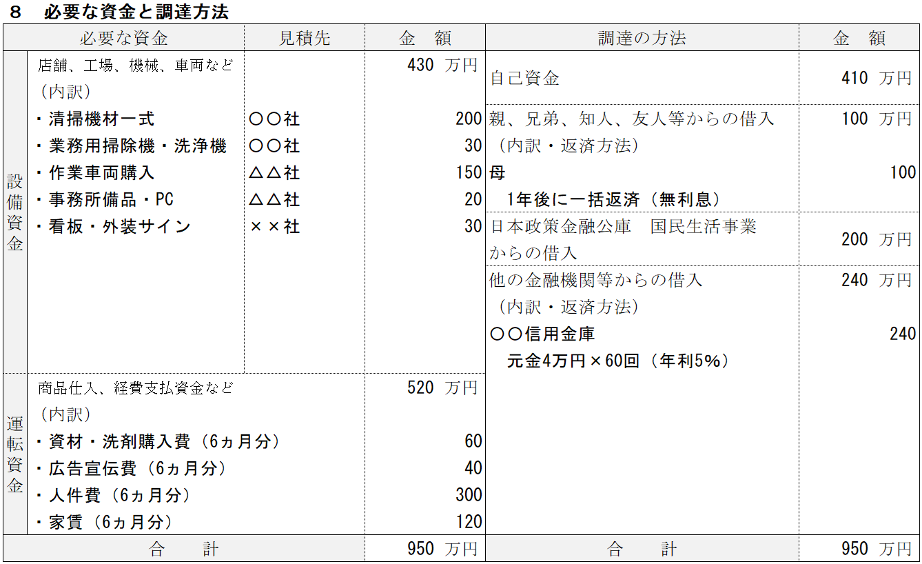 ⑧必要な資金と調達方法事業で必要になる設備資金と運転資金、そしてそれらをどのように調達するかを整理します。