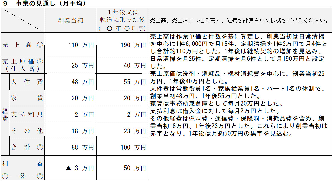 ⑨事業の見通し創業当初から1年後(または事業が軌道に乗った後)の財務計画を、算出根拠と合わせて整理します。