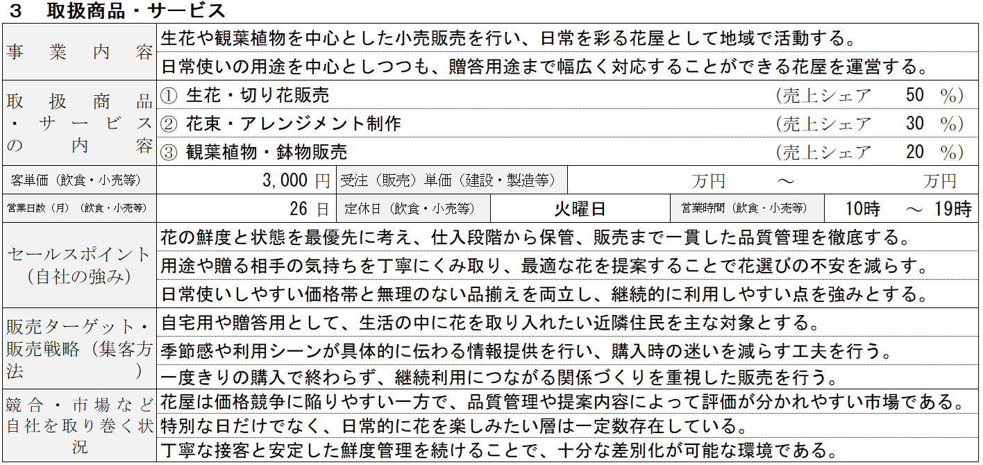 花屋の記入例③ 取扱商品・サービス