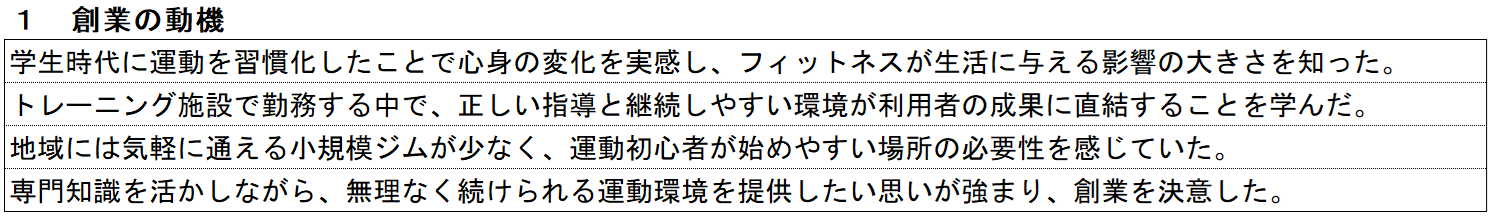 ジムの記入例① 創業の動機