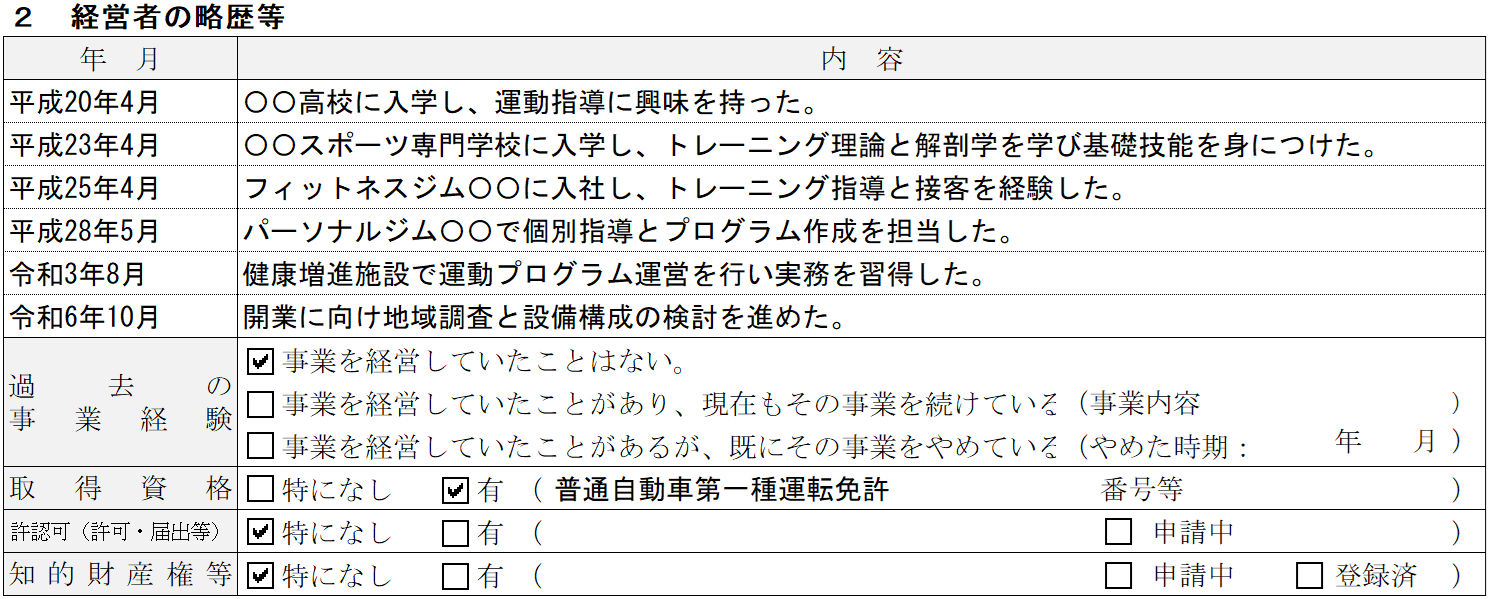 経営者の略歴では、トレーナーとしての経験だけでなく、これまでの社会人経験がどのようにジム運営に活かされるのかを整理することが重要です。指導経験がある場合は、どのような利用者にどのような指導を行ってきたのかを振り返るとよいでしょう。