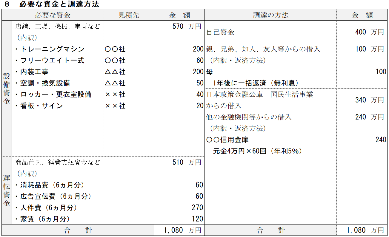 ジムの記入例⑧ 必要な資金と調達方法