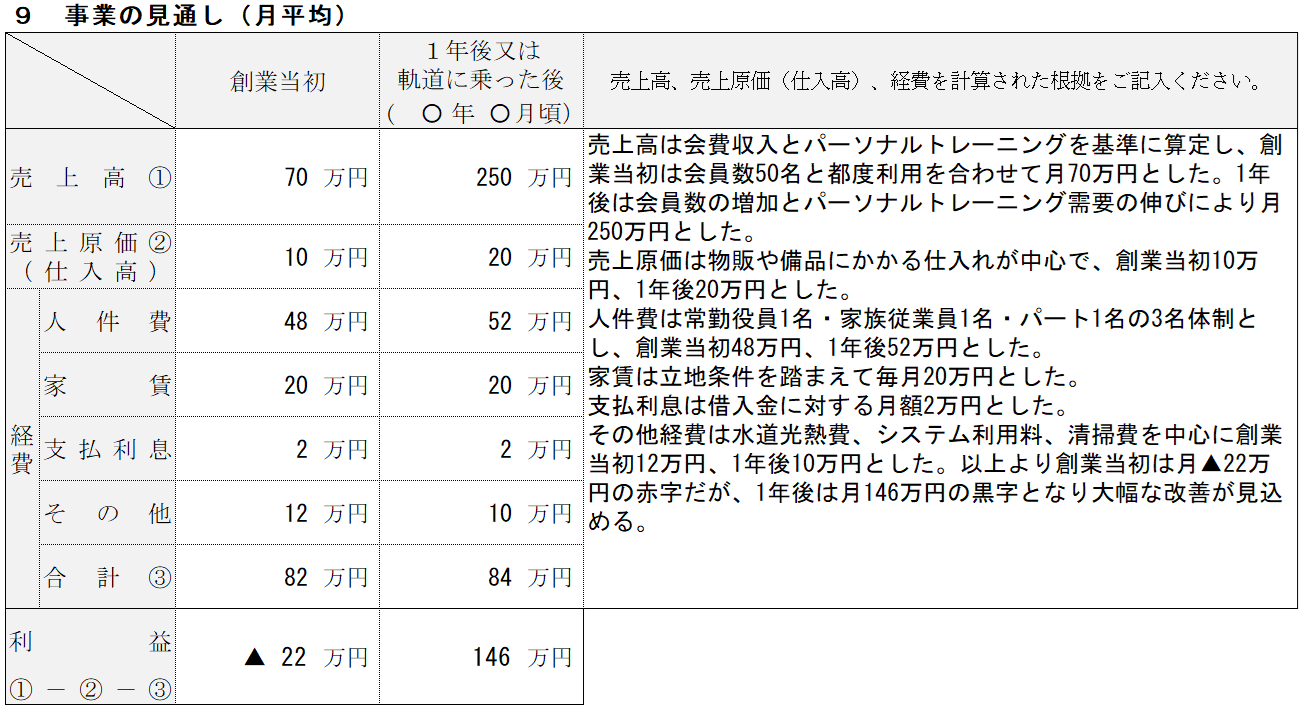 | ⑨事業の見通し | 創業当初から1年後(または事業が軌道に乗った後)の財務計画を、算出根拠と合わせて整理します。 | ||