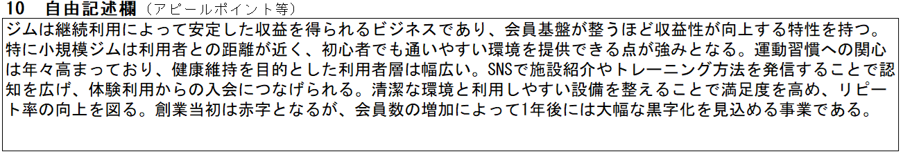 | ⑩自由記述欄 | 他項目では表現できていない事業のアピールポイントを整理します。 | ||