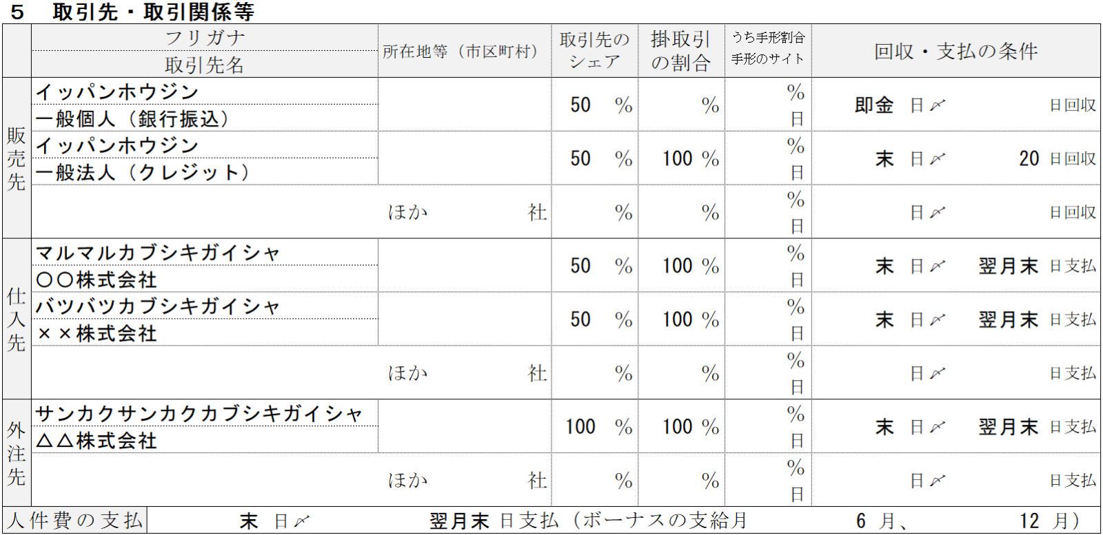 | ⑤取引先・取引関係等 | 販売先・仕入先・外注先など、取引関係を整理します。 | ||