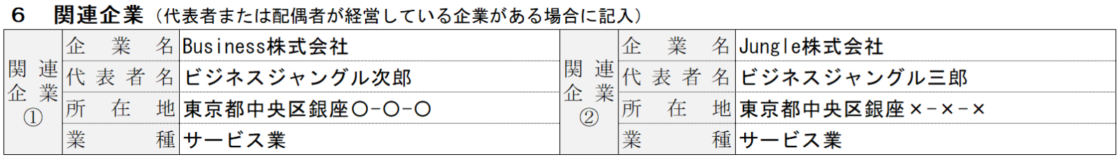 | ⑥関連企業 | 自社に関連する企業を、自分自身あるいは配偶者が経営している場合は整理します。 | ||