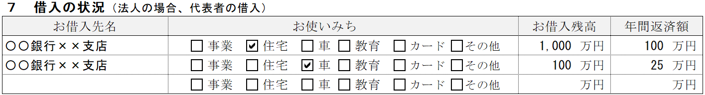 | ⑦借入の状況 | 借入を行っている場合は、代表者個人の借入状況を含めて整理します。 | ||