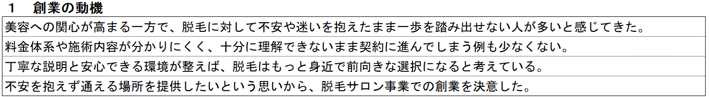 創業の動機では、脱毛に興味がある、美容業界で働きたいといった理由だけでなく、なぜ脱毛サロンという事業を選んだのかを整理します。