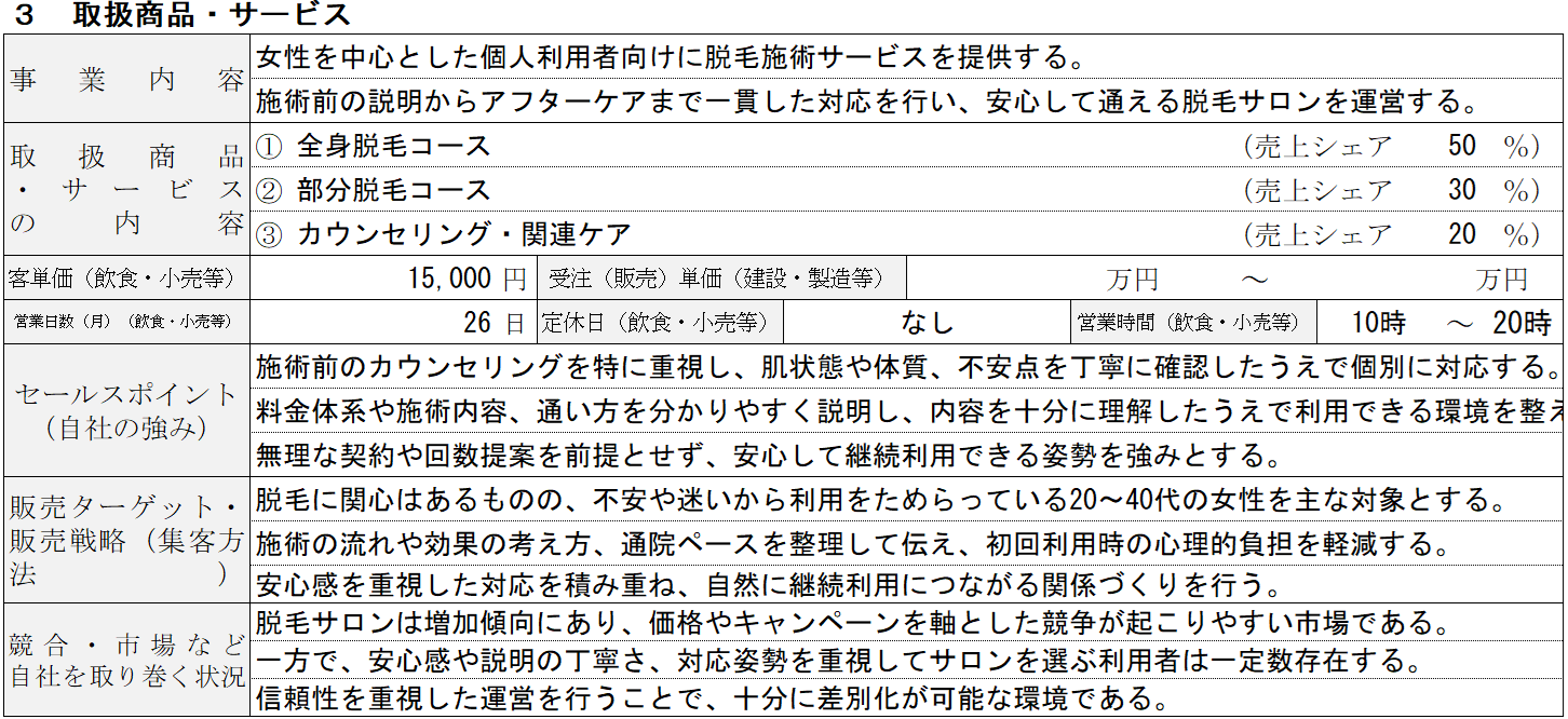 | ③取扱商品・サービス | どのような事業を行い、なぜその事業が成立するのかを、市場・競合・自社の差別化ポイントといった観点から整理します。 | ||