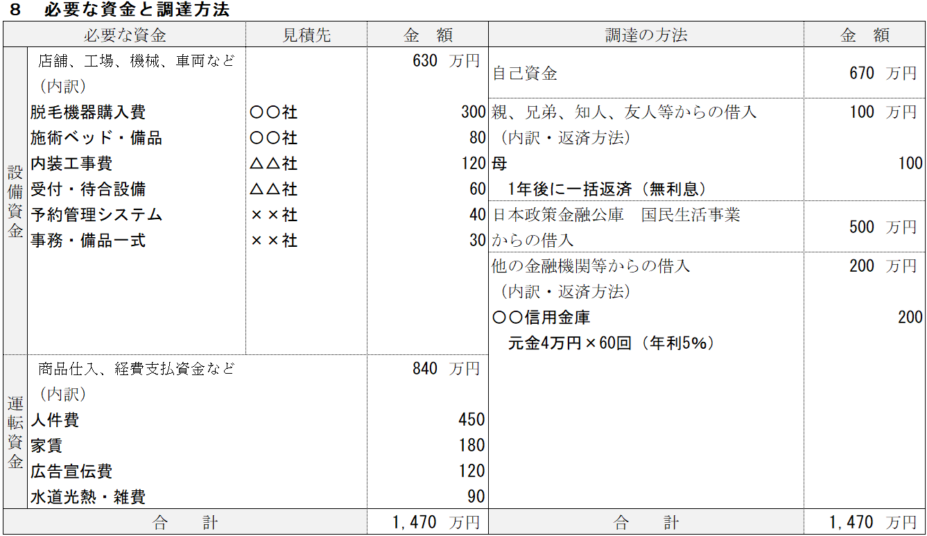 脱毛サロンの記入例⑧ 必要な資金と調達方法