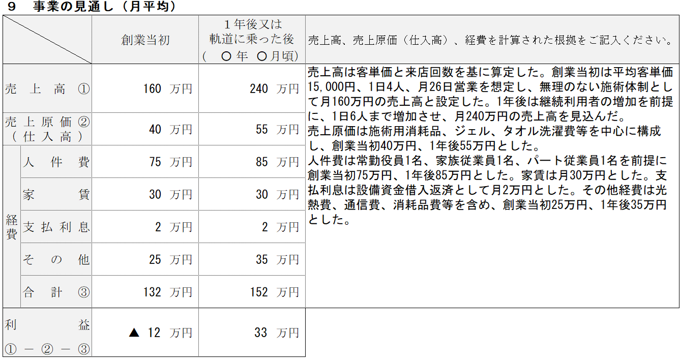 | ⑨事業の見通し | 創業当初から1年後(または事業が軌道に乗った後)の財務計画を、算出根拠と合わせて整理します。 | ||
