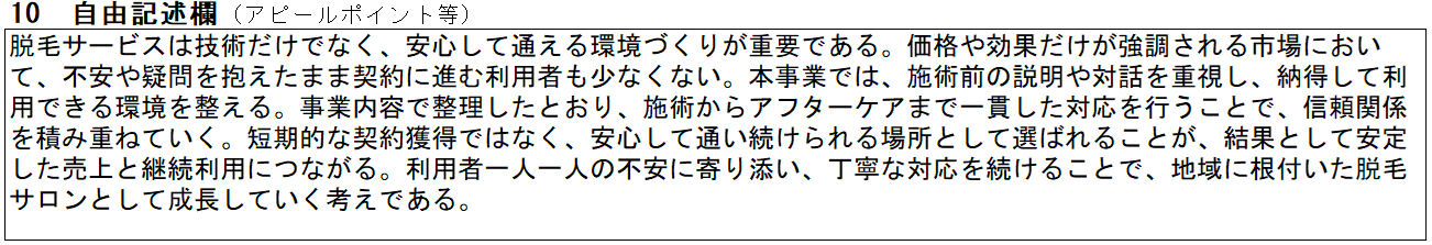 自由記述欄では、これまでの項目では整理しきれなかった判断基準や、事業運営において大切にしたい考え方を言語化します。たとえば、契約を断る判断や、無理な施術を行わない方針など、数値では示しにくい部分を補足します。