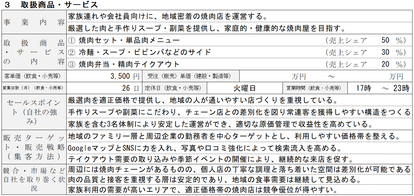この項目では、提供する肉の種類やコース内容を列挙するだけで終わらせてはいけません。重要なのは、どのような焼肉体験を提供する店なのかを明確にし、その設計が市場環境の中で成立すると説明できているかです。