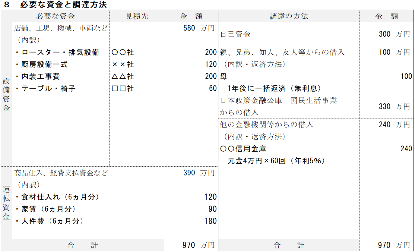 焼肉屋の記入例⑧ 必要な資金と調達方法