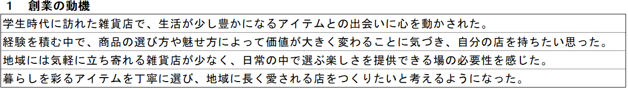 | ①創業の動機 | 「なぜ創業しようと思ったのか」という、事業に対する根源的な思いを整理します。 | ||