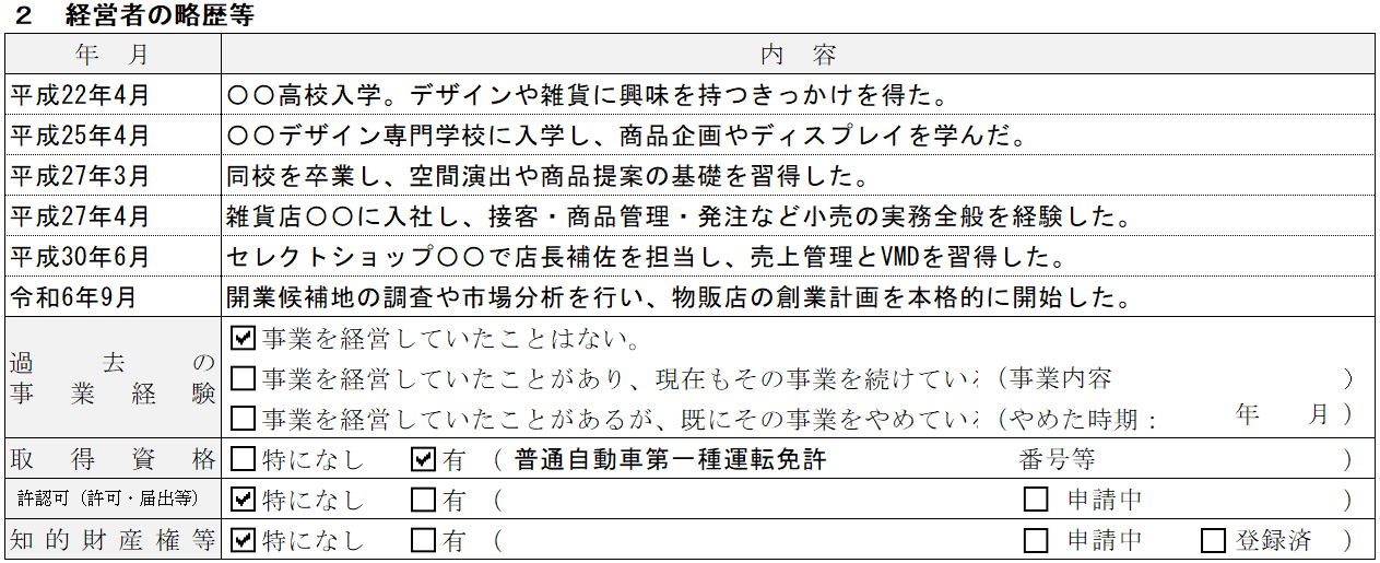 | ②経営者の略歴等 | 経営者の簡単な経歴を、資格保有や許認可取得の状況とあわせて整理します。 | ||