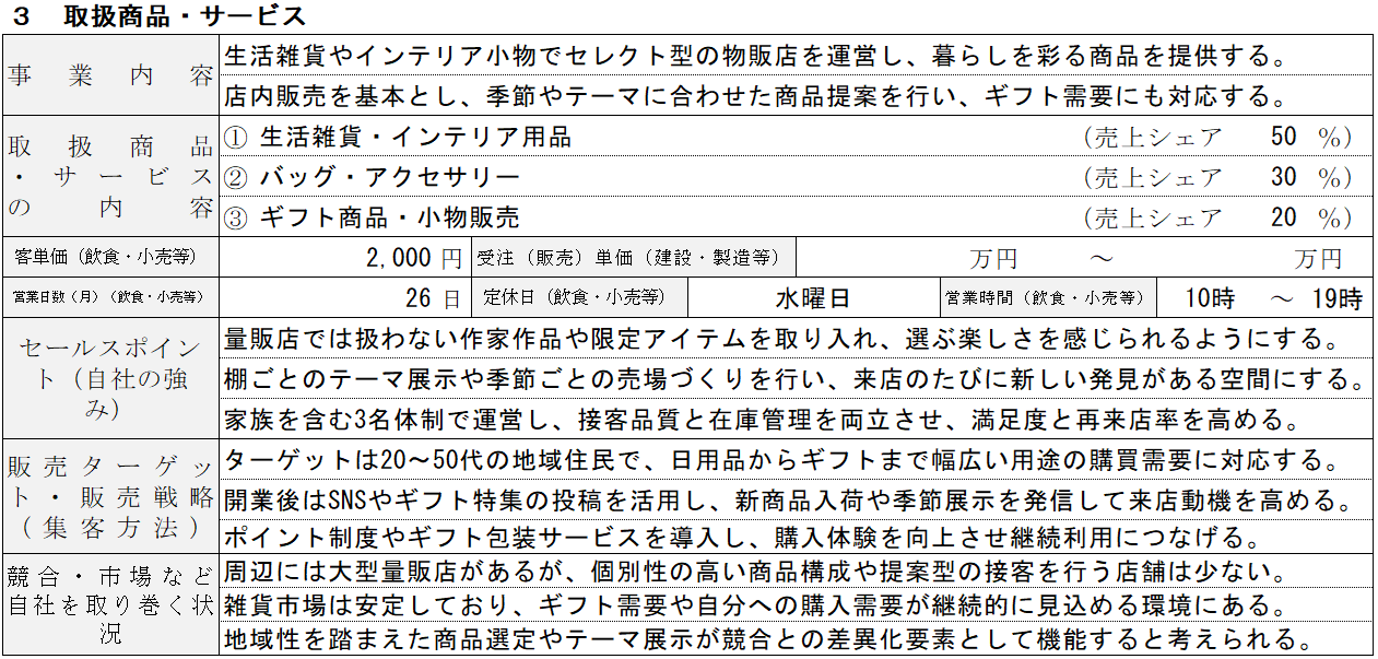 | ③取扱商品・サービス | どのような事業を行い、なぜその事業が成立するのかを、市場・競合・自社の差別化ポイントといった観点から整理します。 | ||