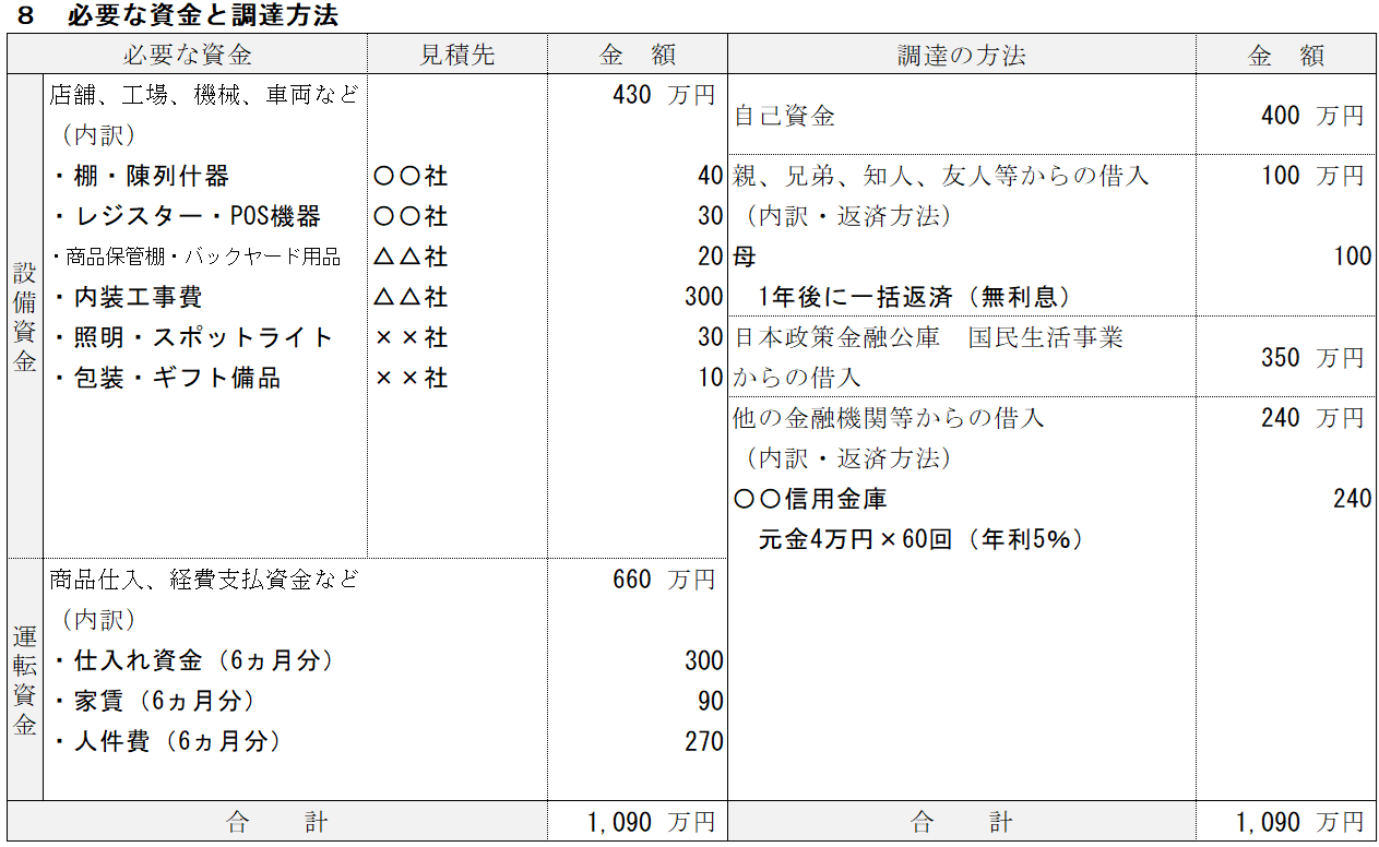 | ⑧必要な資金と調達方法 | 事業で必要になる設備資金と運転資金、そしてそれらをどのように調達するかを整理します。 | ||